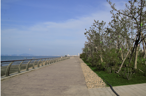 煙臺屬暖溫帶季風氣候,但是瀕海地又受到海洋性氣候的影響,經(jīng)常受海潮海風侵襲和土壤鹽漬化、干旱化威脅,導致適宜生存的植物種類少、綠化難度大。該項目緊臨海邊,因此,如何正確選擇植物品種,在提高植物成活率的同時又保證景觀效果的豐富,是其面臨的一大難題。